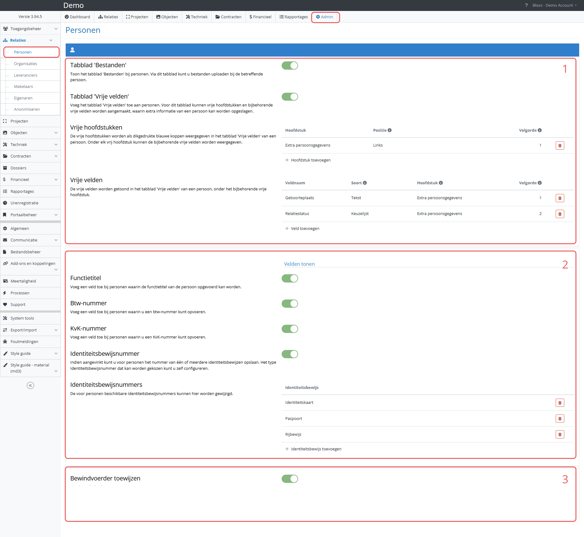 Om de instellingen van personen te configureren, ga naar 'Admin' → 'Relaties' → 'Personen'.