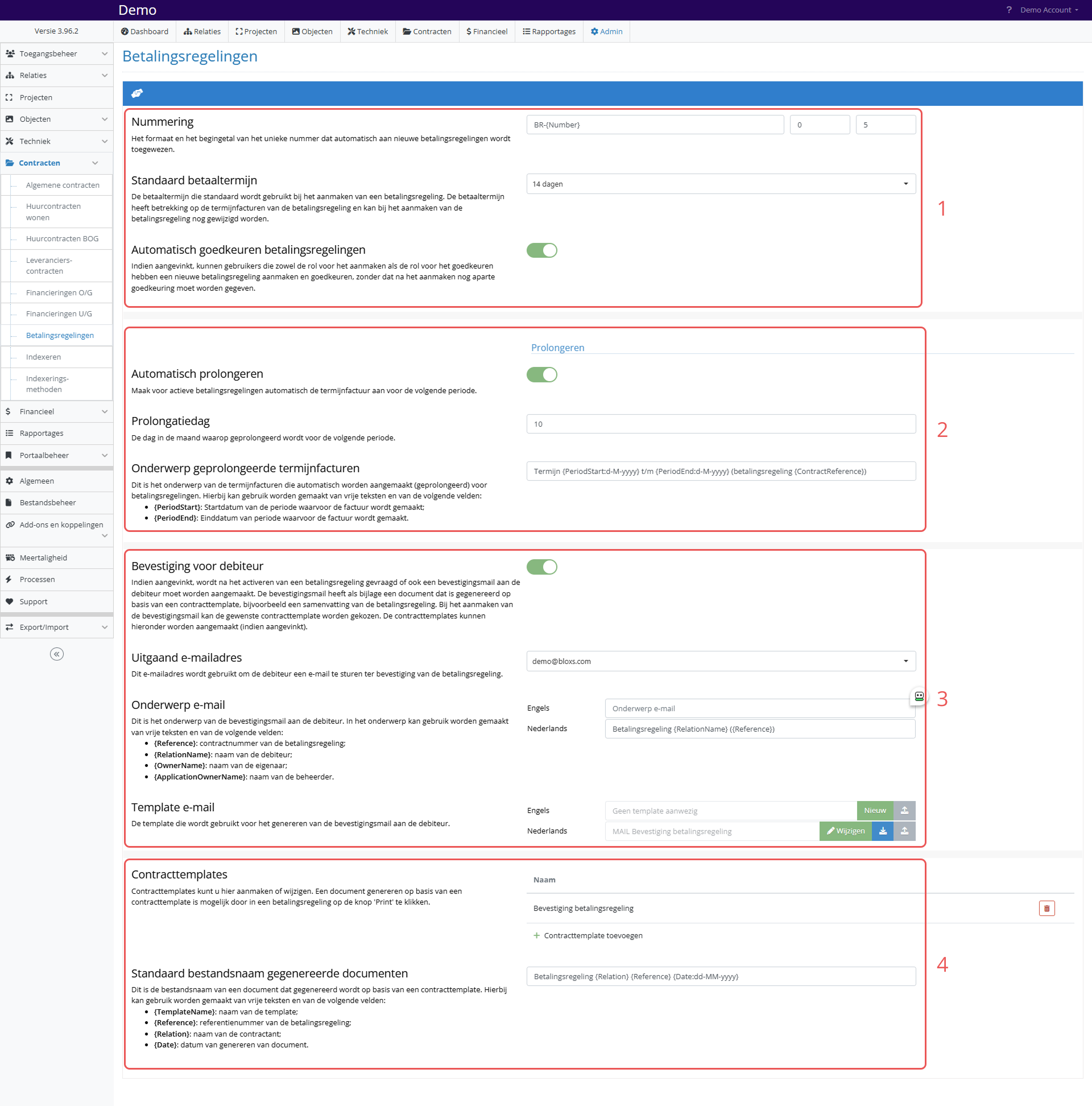 Om de instellingen van betalingsregelingen te configureren, ga naar 'Admin' → 'Contracten' → 'Betalingsregelingen'. Deze functionaliteit dient samen met een consultant geconfigureerd te worden. In dit artikel wordt toegelicht wat de mogelijkheden zijn om deze functionaliteit te gebruiken.