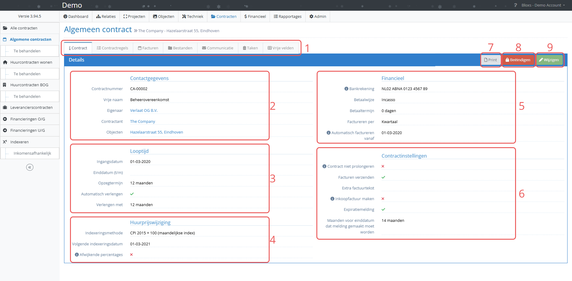 Hier staan de de ingangsdatum, einddatum en opzegtermijn. Daarnaast staat aangegeven of het contract automatisch verlengd moeten worden en wat de verlengingstermijn is.