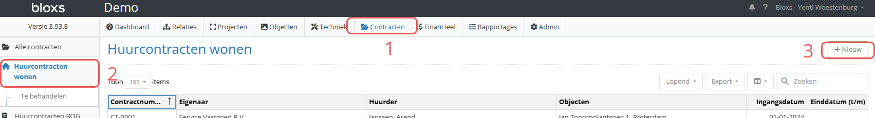 - Klik rechts op '+ Nieuw' om het nieuwe contract aan te maken.