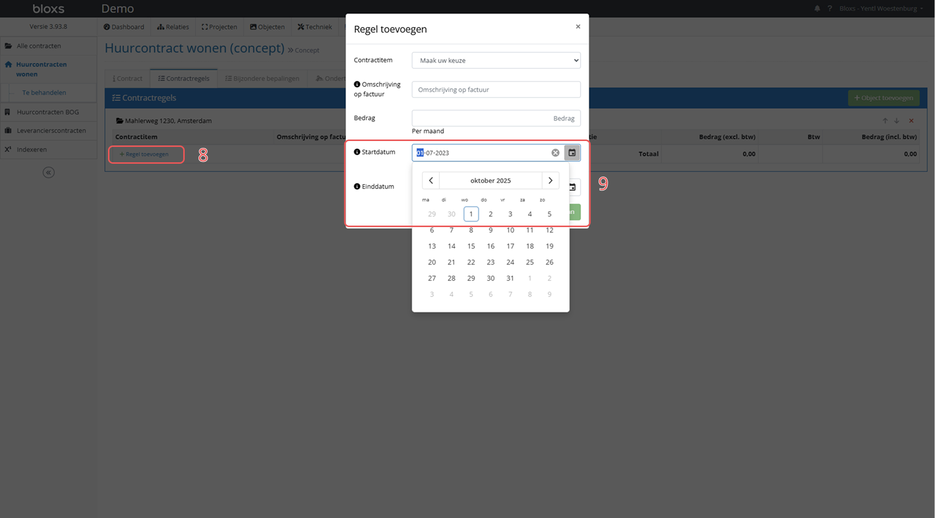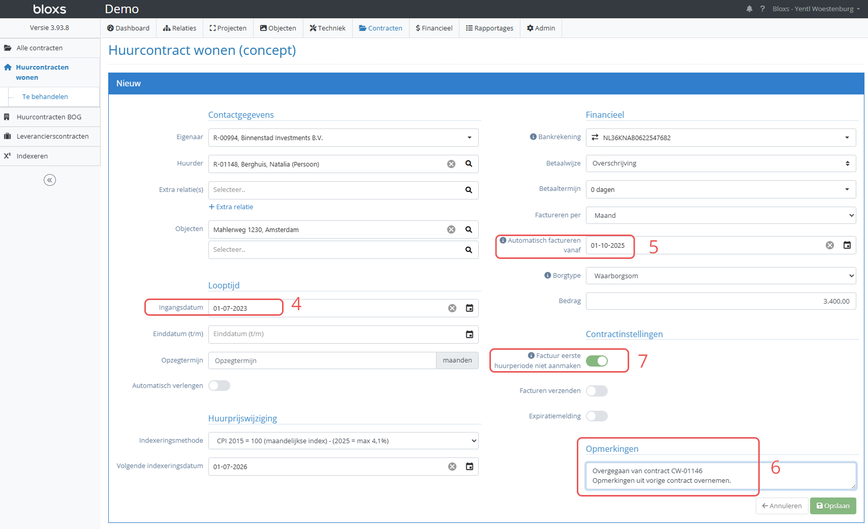 - Bij het aanmaken van een nieuwe contractregel wordt door Bloxs automatisch de startdatum van het contract overgenomen. Dat is hier niet correct, zorg er daarom voor dat de ingangsdatum van de contractregels aansluit op de einddatum van het oude contract.