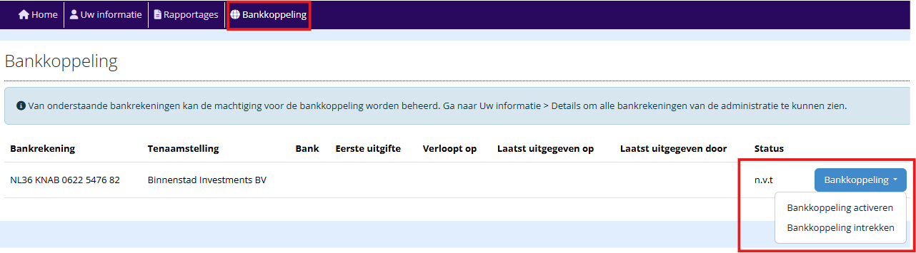 Als je intern volledige toegang hebt tot de betreffende bankrekening, hoef je de koppeling niet via het eigenarenportaal te activeren. Zie: Hoe kan ik een bankenkoppeling opstarten?