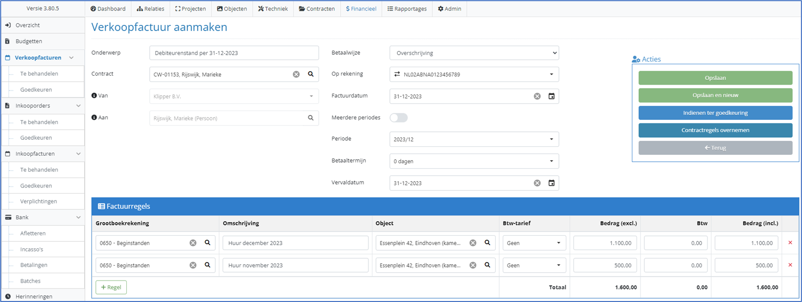 Mocht een (oud-)huurder meerdere openstaande posten hebben, dan kun je meerdere factuurregels gebruiken of per openstaande post een aparte verkoopfactuur aanmaken.