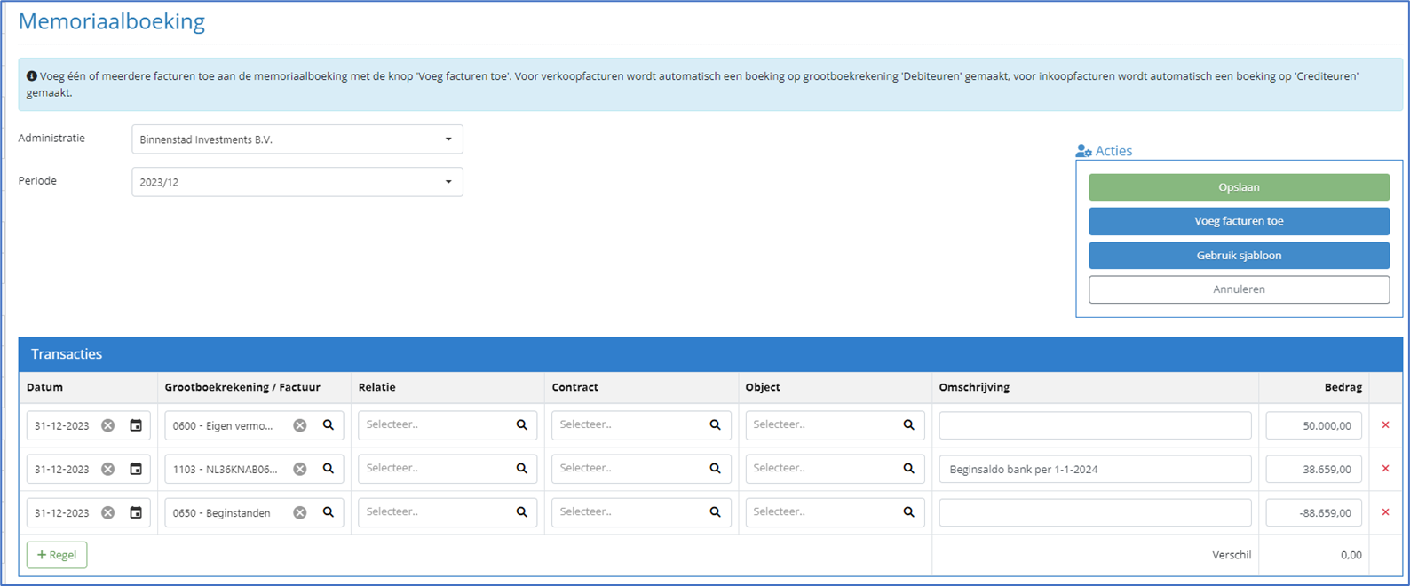 - Vul in de eerste transactieregel als datum de dag vóór de startdatum in